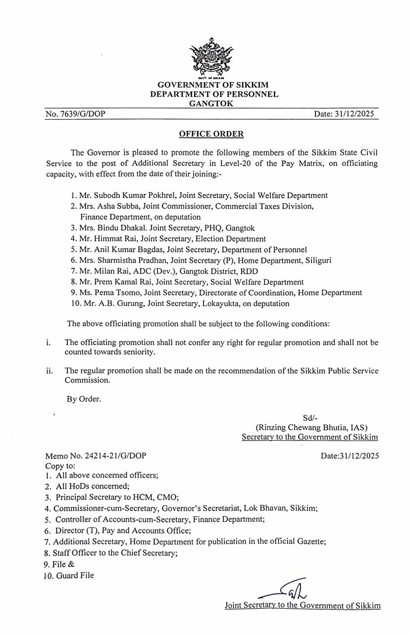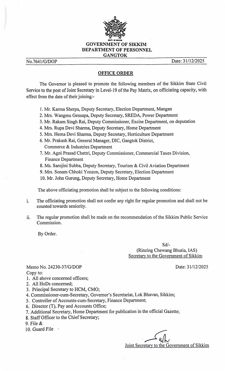 The twenty members of Sikkim State Civil Service have been promoted to the post of Additional Secretary and Joint Secretary on officiating capacity as per the office orders No.7639/G/DOP and No.7641/G/DOP dated 31.12.2025 respectively.